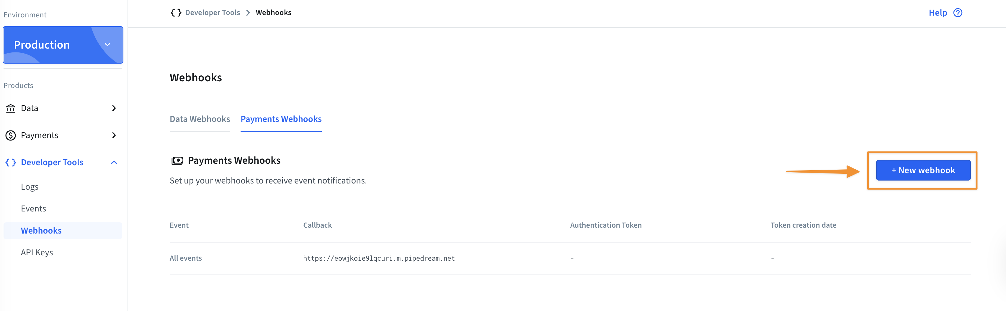 In the Payments Webhooks tab, click +New webhook.