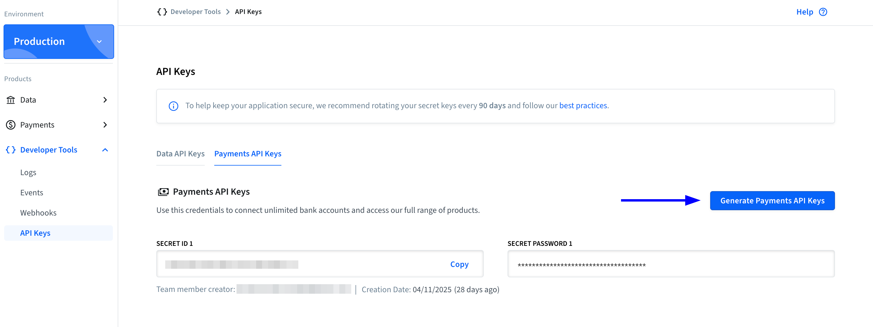 - In the Production environment, go to the Developer Tools - API Keys section of the dashboard.